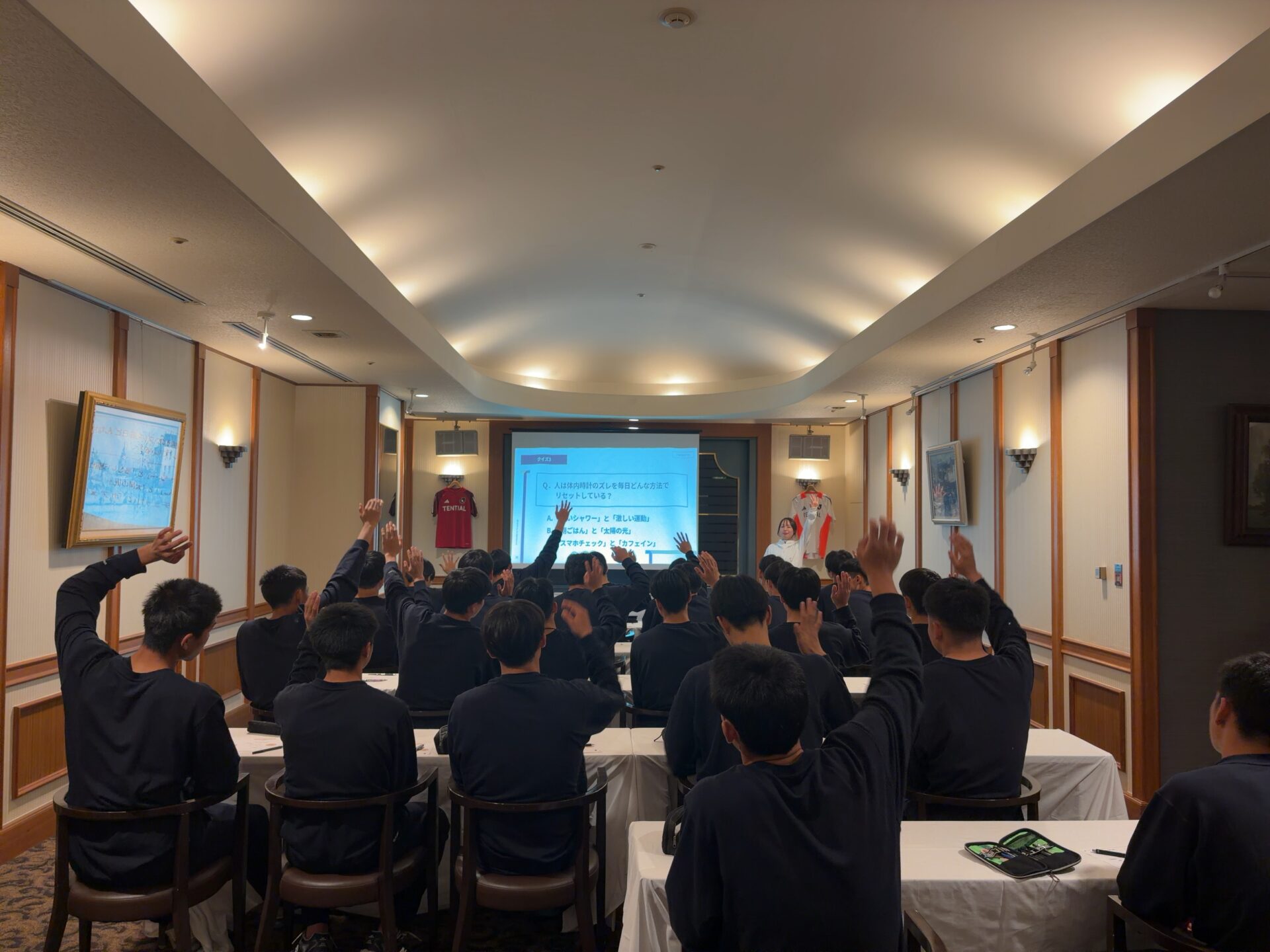 当日は、将来のJリーグを担うU-16選手に向け、睡眠の基礎知識に加え、日常生活で実践できる具体的なテクニックを共有しました。 今回は単なる講義形式にとどまらず、クイズや選手自身が1日のスケジュールを振り返るワークショップを導入。「自らのコンディショニングと向き合う」時間を設けることで、知識をより深く定着させる構成としました。